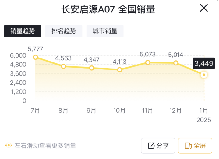 显然,从这个层面来看,2025年1月份,长安启源A07单月销量不足3500台,确实让人感到意外了些。